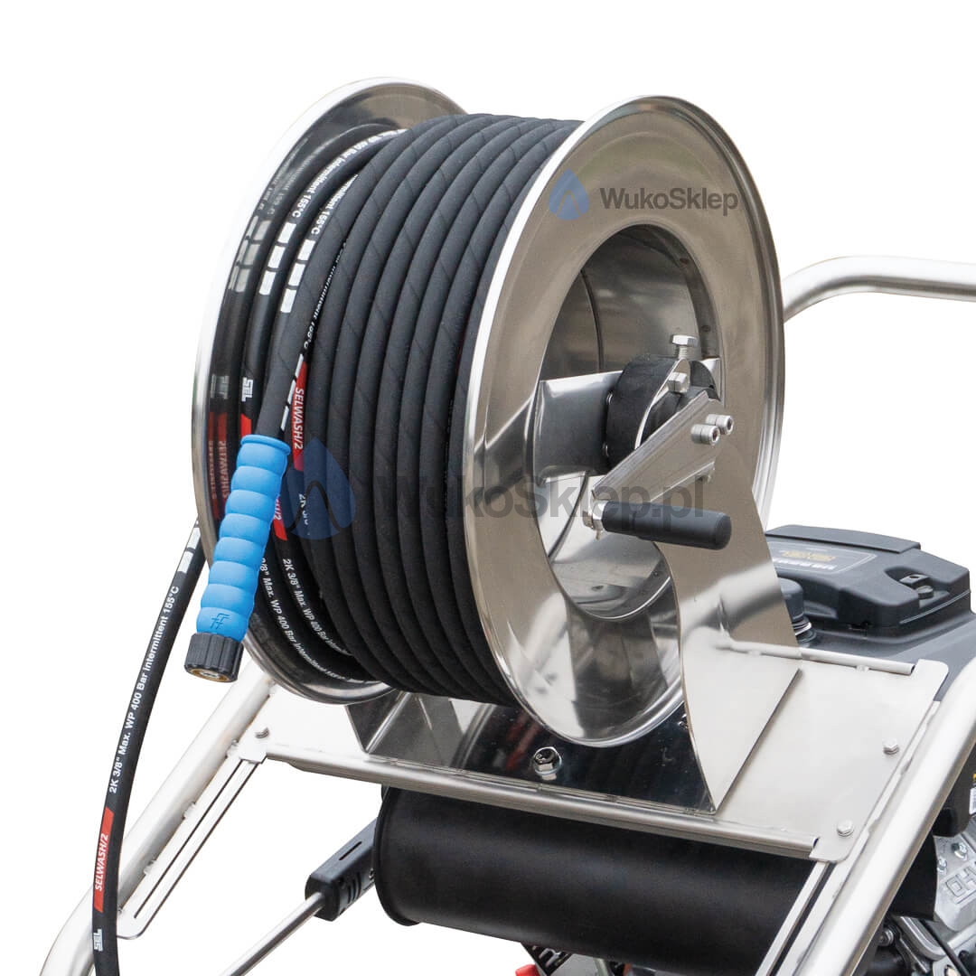 Wytrzymały bęben od renomowanego włoskiego producenta Ramex pomieści nawet 50 metrów węża ciśnieniowego. Wykonany ze stali nierdzewnej, wyposażony w obrotowe złącze do 400 bar, zapewnia wygodę obsługi i chroni przewód przed uszkodzeniem. Zwijanie i rozwijanie węża staje się znacznie szybsze i prostsze, co przekłada się na większy komfort pracy.