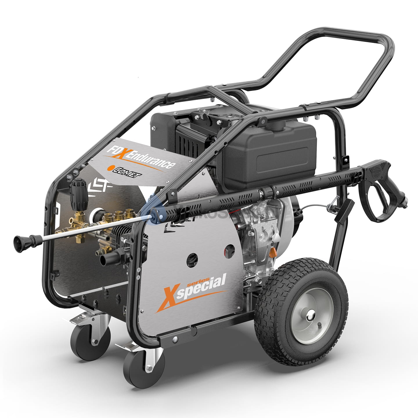 Comet FDX Endurance to w pełni profesjonalna myjka spalinowa generująca ciśnienie robocze na poziomie 280 bar z przepływem 15 l /min. Maszyna przeznaczona jest do intensywnego użytkowania ze względu na zastosowanie przekładni obrotowej oraz niezawodnego silnika Honda GX390.