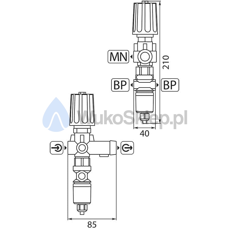 - Przyłącza: wejście: 3/8" F, wyjście: 3/8" F, by-pass: 1/4" F, wejście pod manometr: 1/4" F