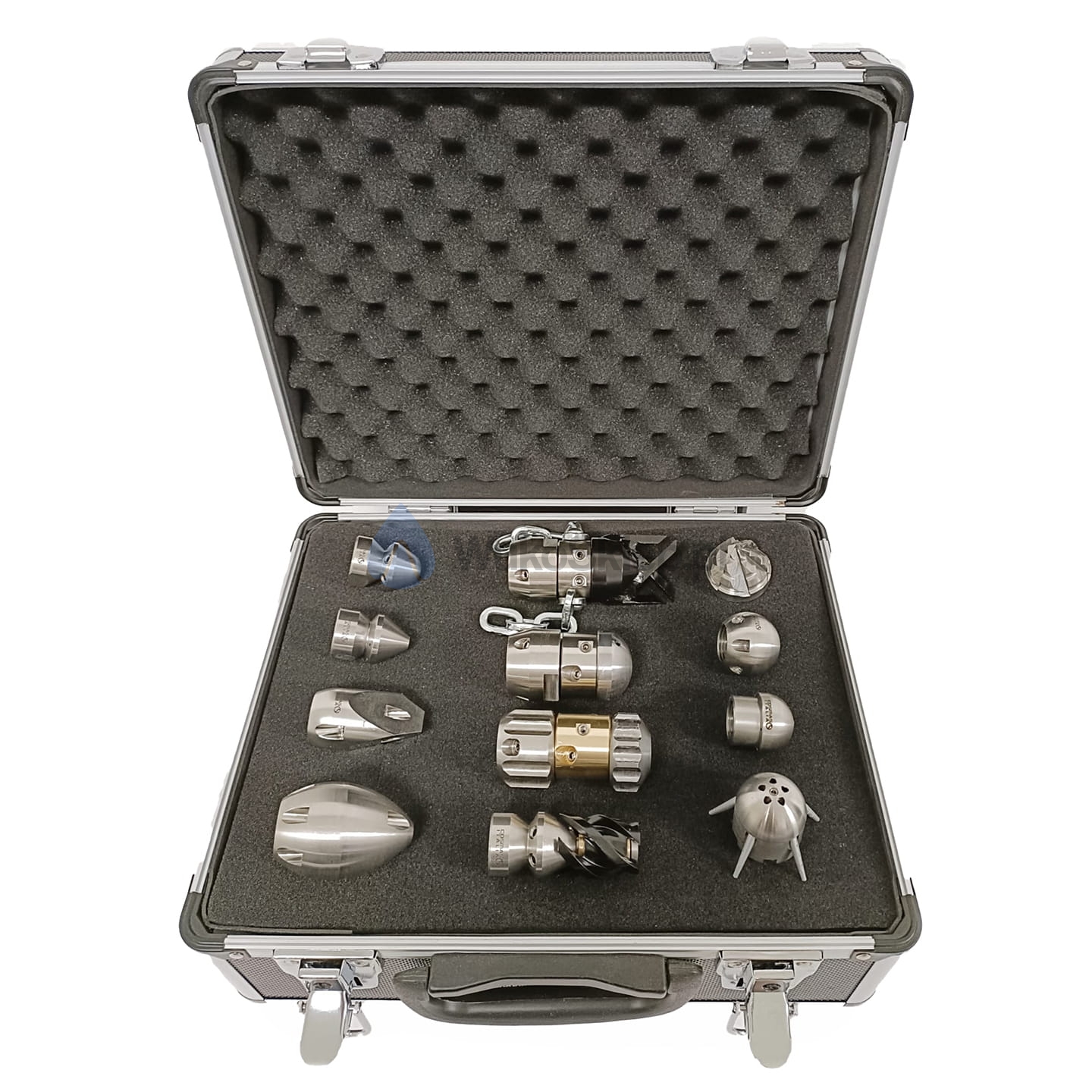 Profesjonalny zestaw w powiększonej wersji "Master" dla specjalistów zajmujących się czyszczeniem rur i kanalizacji. Zawierający różnego typu dysze, aby skutecznie radzić sobie z wszelkiego rodzaju zanieczyszczeniami oraz zatorami. Dysze zostały wykonane z wytrzymałej stali nierdzewnej.